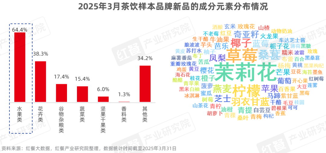 从2025年3月的新品元素来看,水果类元素依旧是茶饮新品的核心成分元素,例如草莓、椰子、凤梨、苹果、芭乐等。其中,一只酸奶牛推出了芭乐葡萄酸奶鲜酪、芭乐葡萄酸奶昔,7分甜推出了黑桑葚·四重莓果和黑桑葚·莓果酸奶。相较于2月,在3月的茶饮新品中,除茉莉花、草莓等通用元素外,桑葚、凤梨、油柑等特色水果元素的应用进一步增加,体现了茶饮品牌更注重口感与营养的创新搭配。