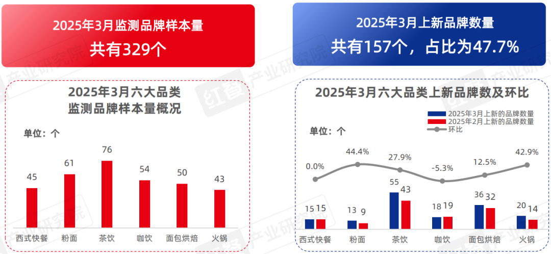 为洞悉餐饮行业产品上新发展趋势,红餐产业研究院选取了餐饮行业具有代表性的六个品类作为监测对象,包括西式快餐、粉面、茶饮、咖饮、面包烘焙、火锅这六大品类。红餐产业研究院监测的品牌样本量一共有329个,2025年3月六大品类中共有157个品牌推出新品,占监测品牌样本量的47.7%。