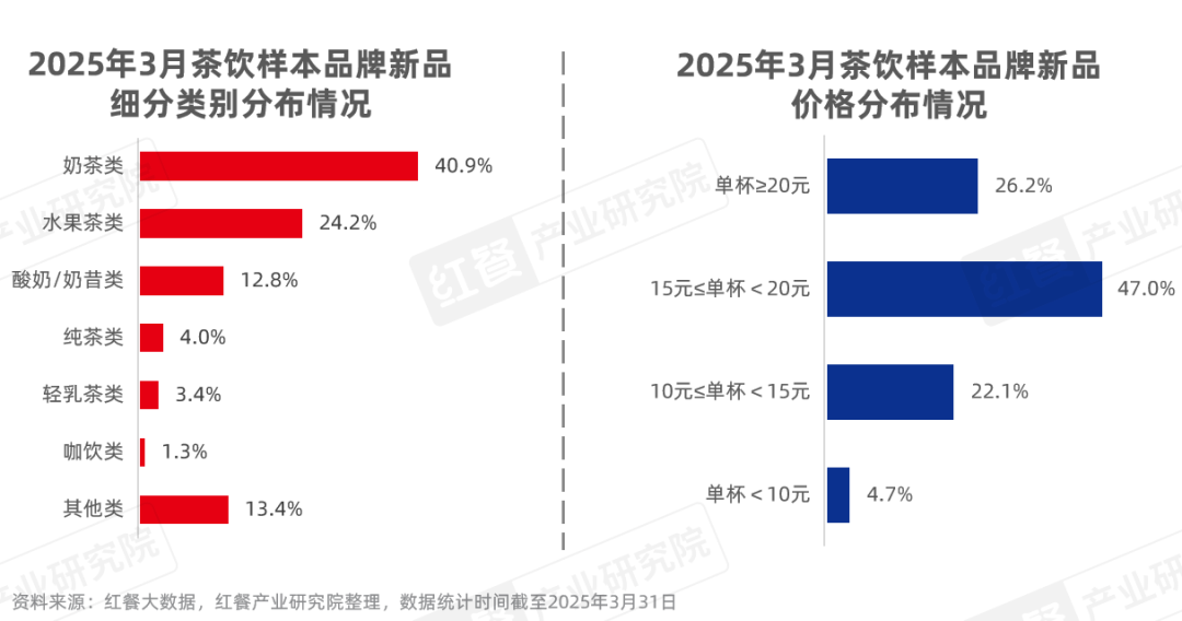 2025年3月,红餐产业研究院监测到有55个茶饮品牌推出了149款新品。其中,奶茶类新品最多,共计61款,占当月茶饮新品数量的40.9%;水果茶类新品数量次之,为36款,占比24.2%。