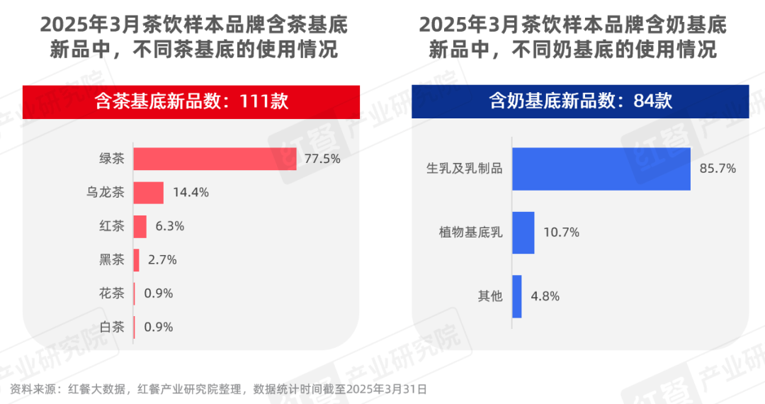 从新品的茶基底来看,2025年3月含茶基底的新品共有111款。其中,绿茶以77.5%的占比成为主流成分,例如,茉莉绿茶、龙井茶(如浙江龙井、越州龙井)、碧螺春、抹茶(如贵州抹茶、径山抹茶等)等知名绿茶品种高频出现,受茶饮品牌青睐。