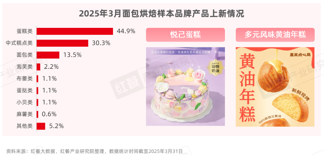 2025年3月,面包烘焙新品涵盖的类别较丰富,有蛋糕类、中式糕点类、面包类、其他类等9种类型。其中,蛋糕类新品数量最多,3月共推出80款,占面包烘焙新品总数的44.9%;其次是中式糕点类,共上架54款新品,占新品总数的30.3%。