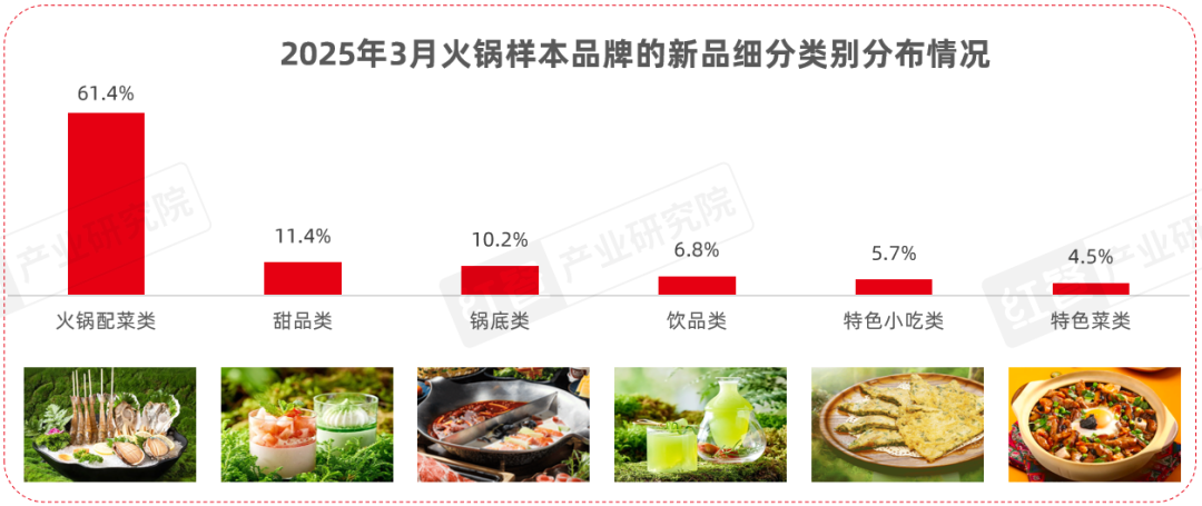 2025年3月,在红餐产业研究院监测的火锅品牌中,有22个火锅品牌共推出了88款新品。从新品的细分类别来看,当月火锅新品涵盖的类别有火锅配菜类、甜品类、饮品类、锅底类、特色小吃类和特色菜类。