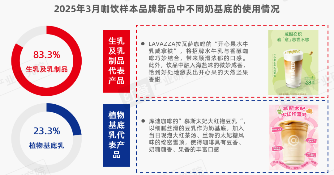 2025年3月的咖啡类新品中,奶基底趋向生乳及乳制品,植物基底乳风味升级。咖饮品牌在新品中使用的奶基底主要分为生乳及乳制品、植物基底乳、植脂末与脂质乳和其他四大类。红餐产业研究院监测发现,2025年3月,在咖饮样本品牌的含乳基底新品中,生乳及乳制品占据主导地位,占比达83.3%。其中,牛乳应用最广泛,强调“100%动物乳脂肪,0植脂末、0植物油”等健康属性。