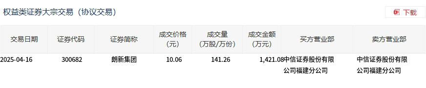 4月16日,朗新集团大宗交易成交141.26万股,成交额1421.08万元,占当日总成交额的7.76%,成交价10.06元,较市场收盘价11.99元折价16.1%。