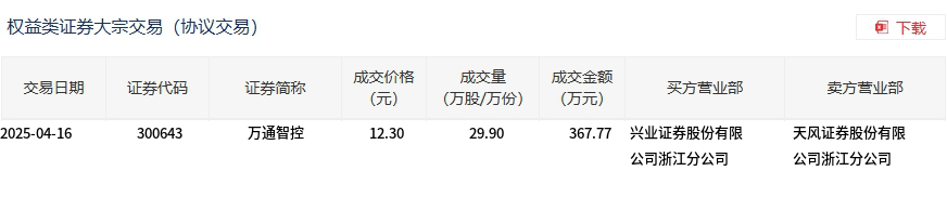 4月16日,万通智控大宗交易成交29.9万股,成交额367.77万元,占当日总成交额的4.47%,成交价12.3元,较市场收盘价13.24元折价7.1%。