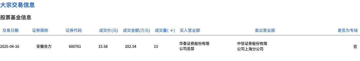 4月16日,安徽合力大宗交易成交13万股,成交额202.54万元,占当日总成交额的0.61%,成交价15.58元,较市场收盘价15.58元持平。