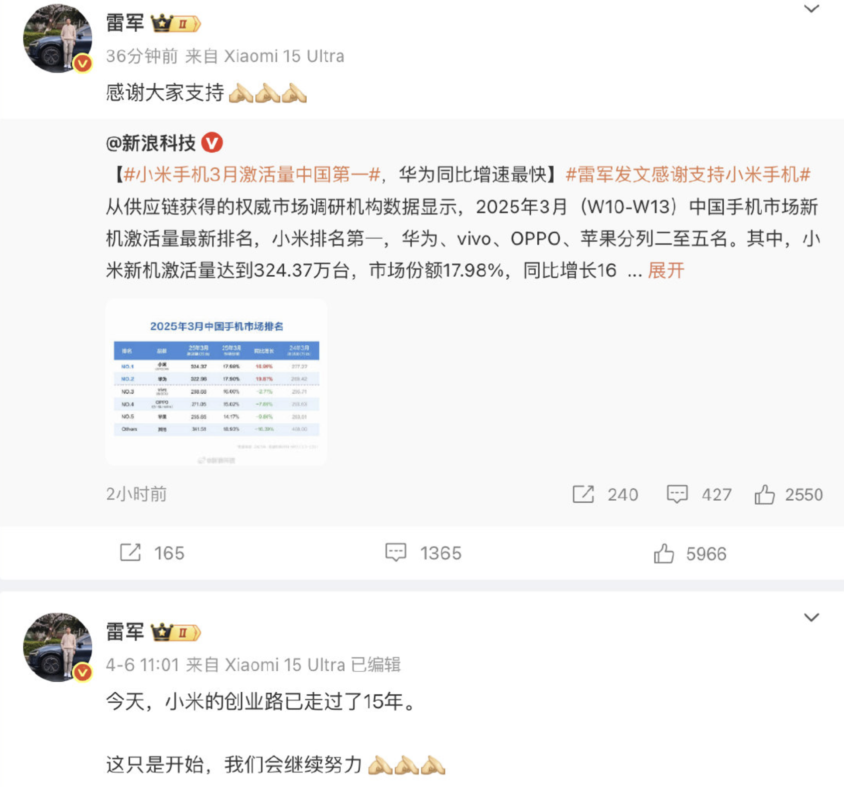 此次发声距雷军上次在社交平台发文已时隔9天,也是他在四月过半后的第三次微博动态。前两次分别是纪念小米创业15周年,他发布短评:“今天,小米的创业路已走过了15年。这只是开始,我们会继续努力。”
