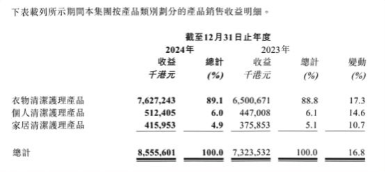 不过长期以来,蓝月亮集团的主要业绩增长大多依赖于衣物清洁护理品类。从其2024年业绩公告来看,衣物清洁护理产品的营收在整体营收中占比89.1%,贡献了绝大部分的收益。就近几年而言,这一比例持续在上涨,2020至2023年,分别为80.0%、85.0%、85.8%和88.8%。