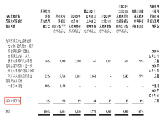 与之相对应的是,在研发方面,蓝月亮集团的资金投入则十分有限。财报显示,2021年至2023年期间,蓝月亮集团研发费用在3000万-6000万港元(约合人民币2825.66万-5651.31万元)之间。2024年亦是如此,蓝月亮集团在研发上投入了4400万港元(约合人民币4144.30万元),同比下滑15.38%。