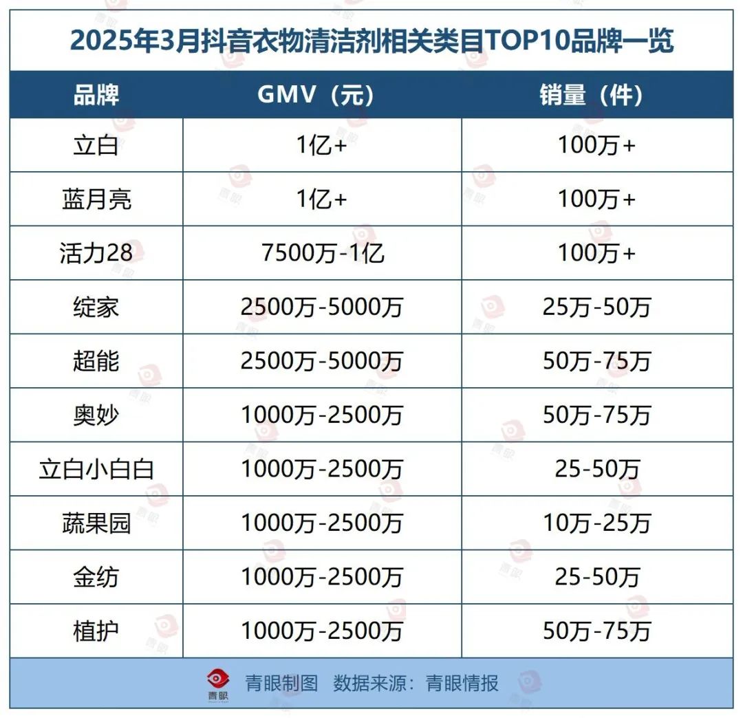 青眼梳理了2025年3月抖音衣物清洁剂相关类目TOP10品牌榜,发现立白已超过了蓝月亮,拿下品类TOP1。