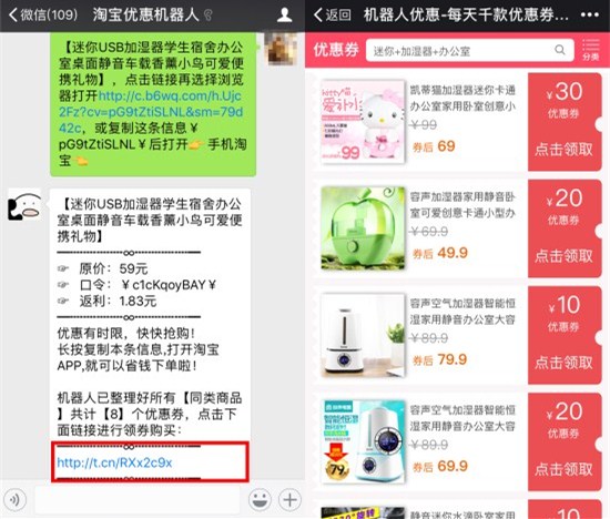 亿邦动力网体验了这个颇具智能色彩的玩法:在淘宝中随机选择一款加湿器,将淘宝链接发给机器人,大概两秒后便收到了优惠信息和推荐链接;打开链接,可以看到很多相似产品的优惠列表。