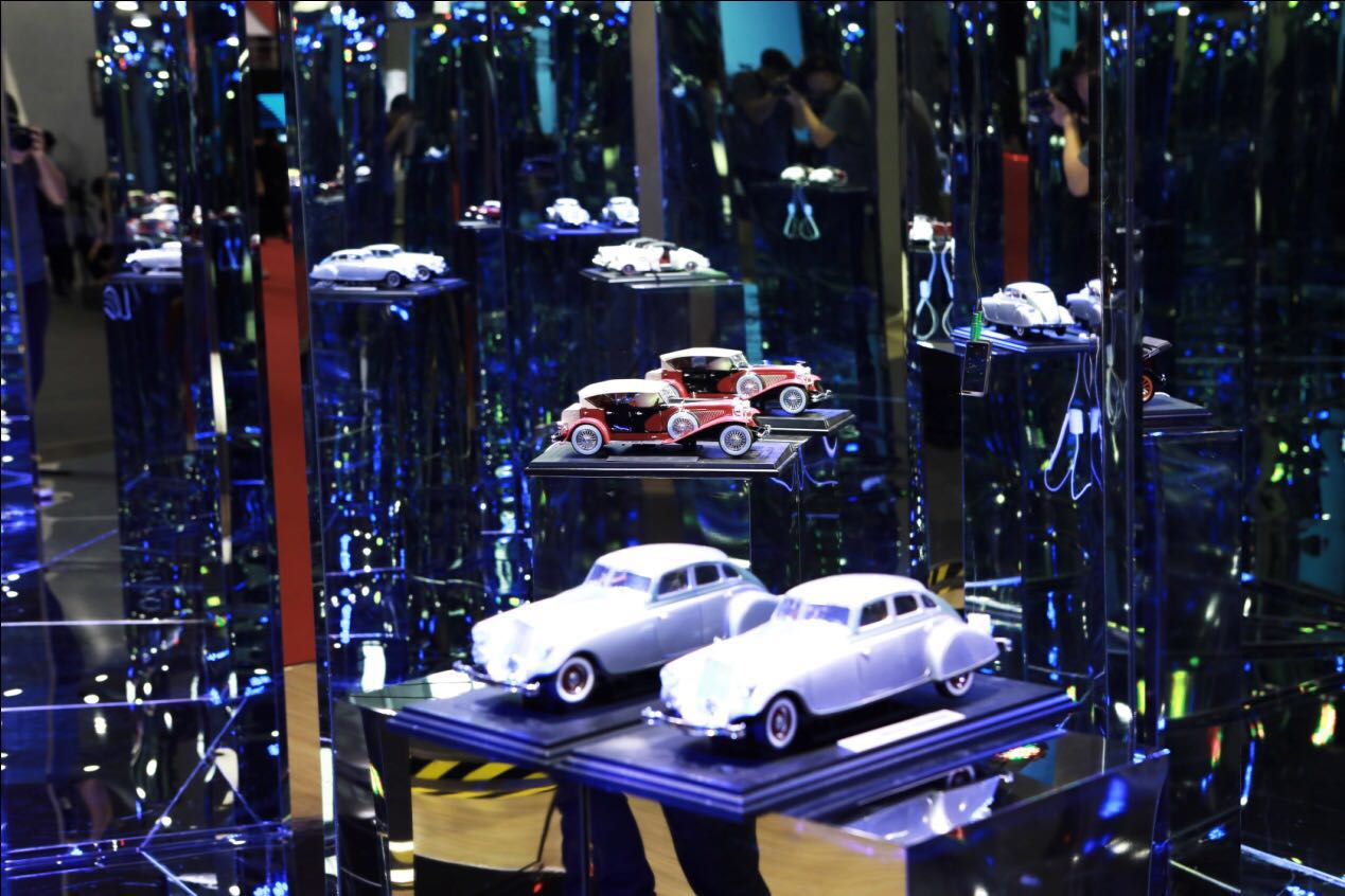 观展者将会在现场领略到抽象艺术家张泓先生的巨幅抽象作品,巨幅画布仿佛生活的洪流,所有生命都将流逝为痕迹,观止让我们识别出某个个体曾经的惊鸿一瞥。岭南画派主将陈永锵先生则一改往日恢弘,系列国画小品生动诙谐,古今交错,人生况味跃然纸上。汽车和手机,不仅是人类工业水平的集大成者,还是人类想像力的验证,分别在不同时代打破了时空的极限,洪健、徐明松、李喆、沈浩鹏4位跨界艺术家用手机记录下了汽车稍纵即逝的瞬间,动静之间充满艺术张力。而进入李怡蓉女士的镜面反射装置空间,观展者则会置身自我反观的抽离体验,以镜面的反射和折射形成的物理现象,搭配汽车(模型)的幻影,成为以前卫、艺术、乐趣、即时分享的理念打造的一场前所未有的视觉艺术。