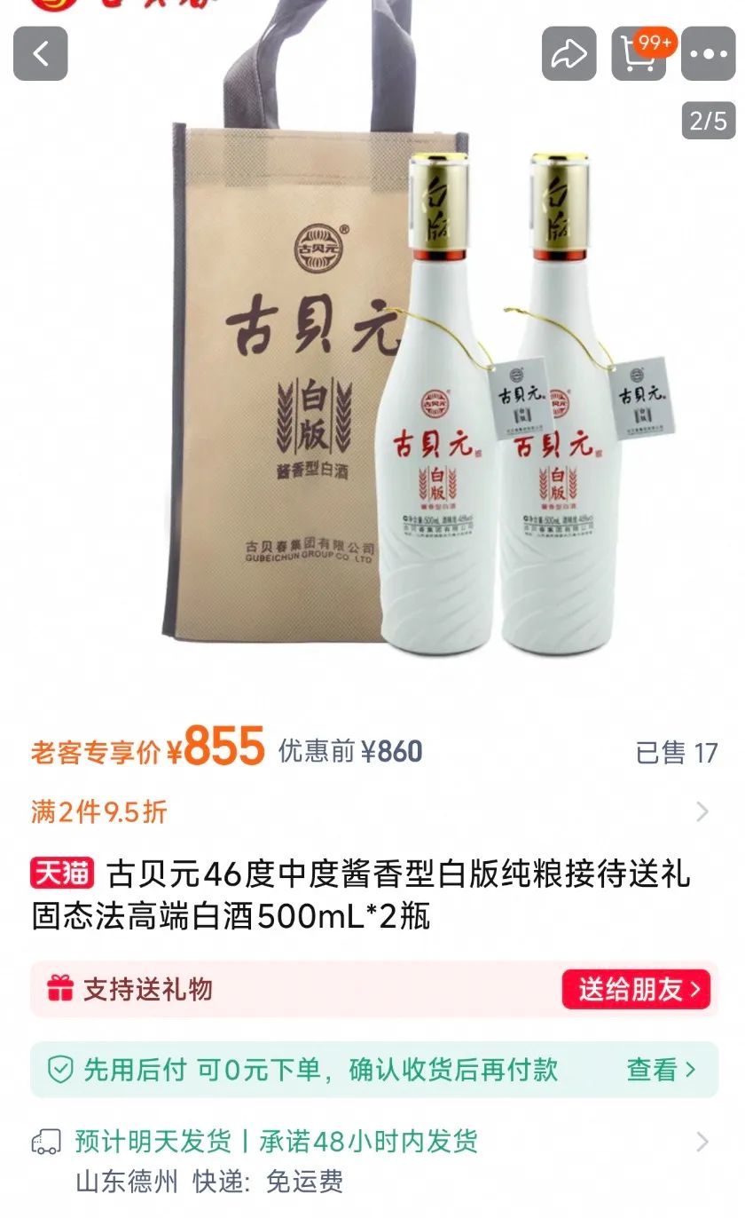 酒讯注意到,目前古贝春部分产品的实际售价远低于官方定价,以古贝春主推的双白板为例,古贝春水晶白板 52度 500ml双瓶装官方定价790元,而在淘宝搜索该产品,获得结果较少,且价格在550元以下,在拼多多平台搜索该产品,6瓶装定价1459元,换算成单瓶不到250元;古贝元白版 46度 500ml双瓶装官方定价860元,搜索该商品结果更少,仅在一家店铺搜索到同款商品,价格在660元。