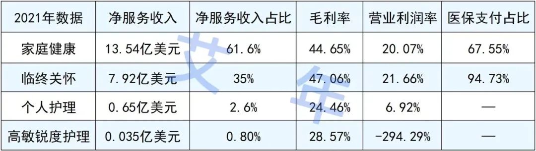 家庭健康、临终关怀贡献了大部分净服务收入、营业利润,个人护理和高敏锐度护理起步时间较晚,是在原有业务基础上拓展的新业务,和原来的业务具备协同效应。