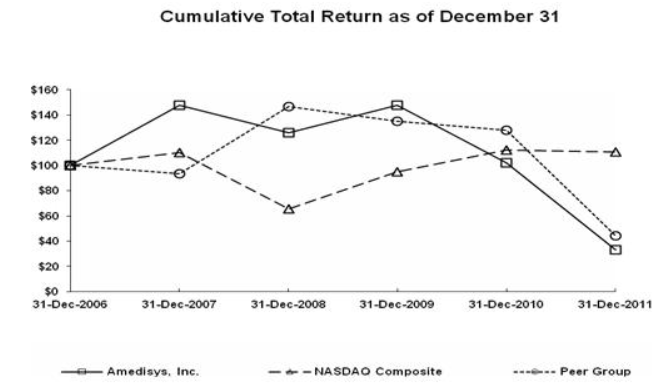 2006~2010年,Amedisys 和竞争对手的股价大概在100美元~150美元上下波动;2011年,股价大幅下滑。