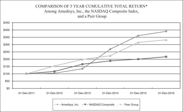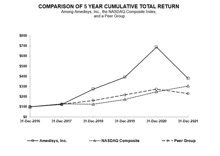 从2014年开始,Amedisys 的股价开始超过 NASDAQ、竞争对手。