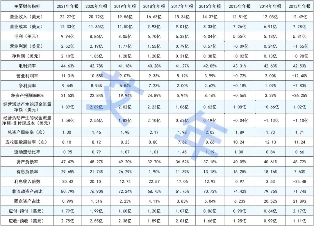 2021年,经营活动产生的现金流量净额为1.89亿美元,比2013年增长85.3%,9年中有4年处于负增长状态,不是很稳定。除了2014、2021年,经营活动产生的现金流净额都高于净利润,说明公司的净利润大部分是现金。
