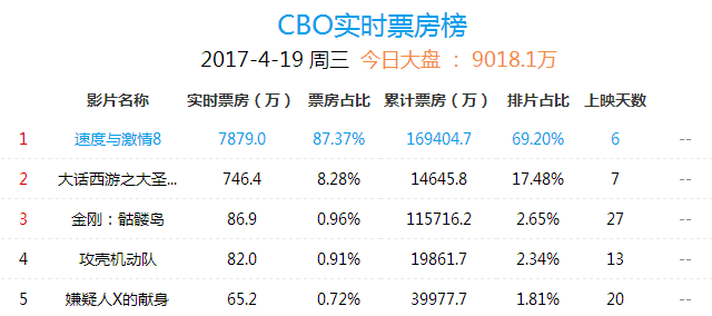 这才6天而已,票房极限还不可预知。据中国票房网的排片率显示,《速8》仍保持70%左右的排片,这部让各大影院经历提前完成KPI的同时,向超24亿元的《速7》、《捉妖记》以及33亿元票房的《美人鱼》发起进攻。