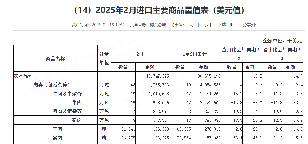 而在今年,这一情况已发生转变,进口牛肉的数量开始下滑。海关数据显示,今年1-2月,我国进口牛肉的数量同比下降11.3%至47万吨。