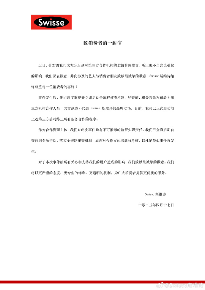 4月17日,@Swisse斯维诗 发布致消费公开信:针对因公司未充分尽到对第三方合作机构的监督管理职责,所出现不当言论引起的影响,公司深表歉意,并向涉及的艺人与消费者致歉。“经查证,相关言论发布者为第三方机构合作人员,其言论绝不代表Swisse斯维诗的品牌立场。目前,我司已正式启动与上述第三方公司终止所有业务合作的程序。”此前,该品牌被指在宣传文案中侵权非合作艺人,引发争议。