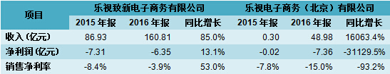 关联方交易金额大幅增加的另一面,是乐视致新神奇的亏损缩窄。数据显示乐视致新2016年实现收入160亿元,亏损6.35亿元,净利率亏损3.9%,较上一年上升4.5个百分点,增长53%。但是与此同时,乐视电子商务的亏损额却是在持续扩大。2016年乐视电子商务实现收入48.98亿元,同比增长160倍,亏损7.36亿元,同比扩大311倍,净利率-15%,较去年扩大93%。