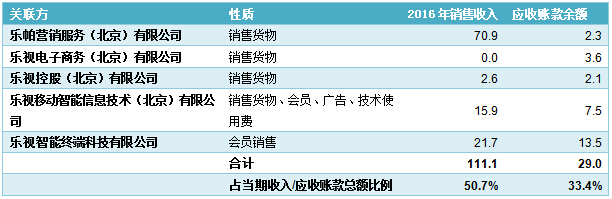 界面新闻仔细翻阅了乐视网的年报,罗列一下几则数据:上市公司向乐帕营销服务(北京)有限公司向销售商品70.86亿元;上市公司向乐视移动智能信息技术(北京)有限公司销售货物、会员15.93亿元;上市公司向乐视智能终端科技有限公司销售会员费21.65亿元;上市公司向乐视控股(北京)有限公司销售货物2.62亿元。上述四家关联公司合计收入111亿元,占2016年全年219亿元销售收入的比例为50.68%。