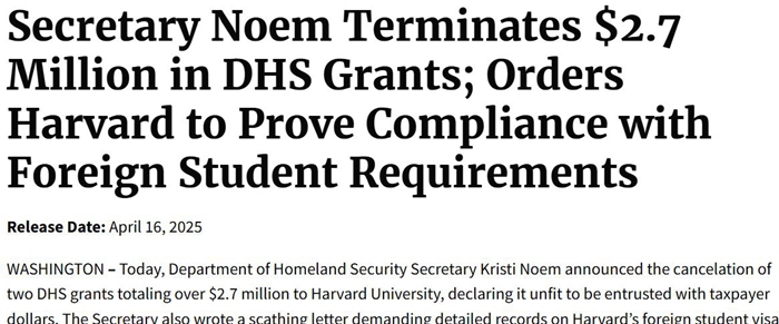 她要求哈佛大学在4月30日之前把该校外国学生的“非法和暴力行动”记录提交给美国国土安全部。如果不遵守要求,哈佛大学将立刻丧失“学生和交流访问学者项目”(SEVP)许可,也意味着无法再招收国际学生。2024-2025学年,哈佛大学有6793名国际学生。