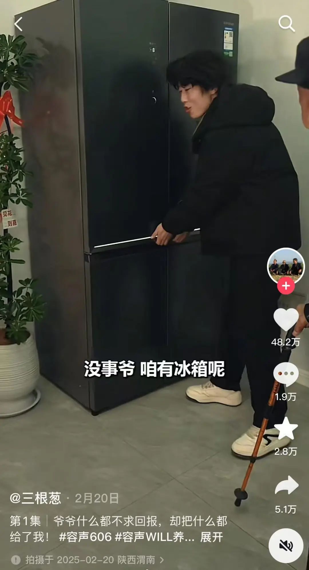 例如达人@三根葱创作的短剧《常回村里看看吧》,其剧情符合他们一贯陕西农村生活的风格,在“孙子回报爷爷,买了一台冰箱”的剧情点上植入容声冰箱。
