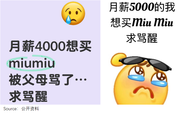 社交平台上,“月薪5000想买MiuMiu”的帖子也铺天盖地,大家似不受控般,争相要为MiuMiu剁手。