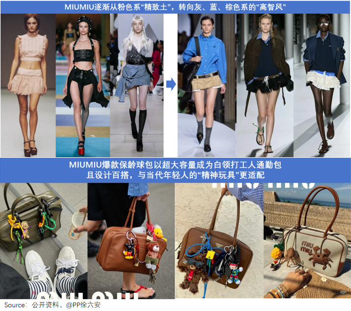 最近,莫莫发现原来热衷香奈儿、Burberry的同事,也穿上了Miu系衬衫,通勤包从LV、Dior大托特替换成了四四方方、鼓鼓囊囊的保龄球包,MiuMiu正以肉眼可见的速度攻略患上年龄焦虑的“大龄少女”们。