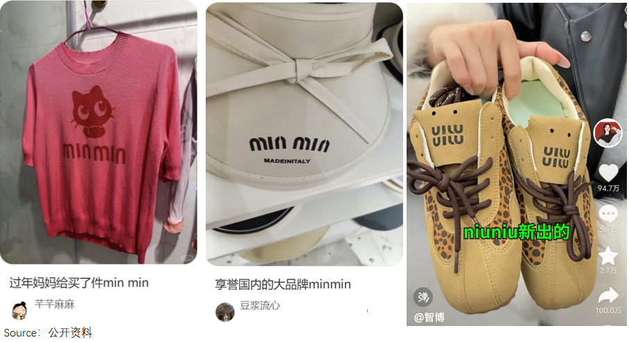甚至,NiuNiu、Miuwiu、WinWin也不鲜见,MiuMiu的“兄弟姐妹”已经取代Sport和Fashion,成为“小工厂不知道写什么但是想写点什么时候的首选词”。