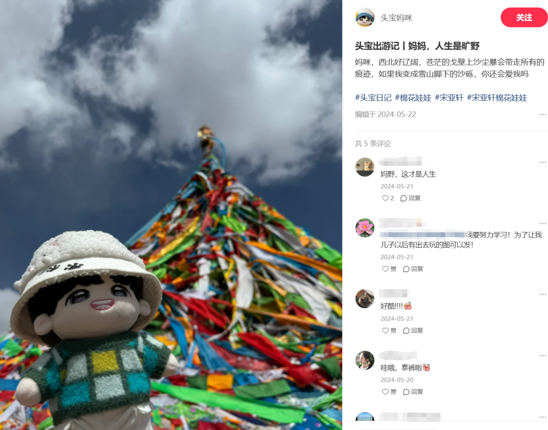 所以小红书上总能看到将娃娃视为「旅行搭子」的「娃妈」们,有带着娃娃在大西北的经幡下打卡,写下「妈妈,人生是旷野」的自我鼓励;有面试带着棉娃以获得勇气的心理暗示的职场新人。