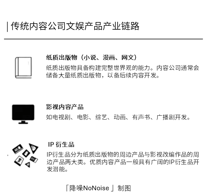 好莱坞的老牌制片厂迪士尼和漫威,他们开创了内容生产从纸质出版物、影视内容产品、IP衍生品的产业生态,通过构建世界观完整、商业形态多元的内容IP,持续不断地满足大众内容消费的需求。