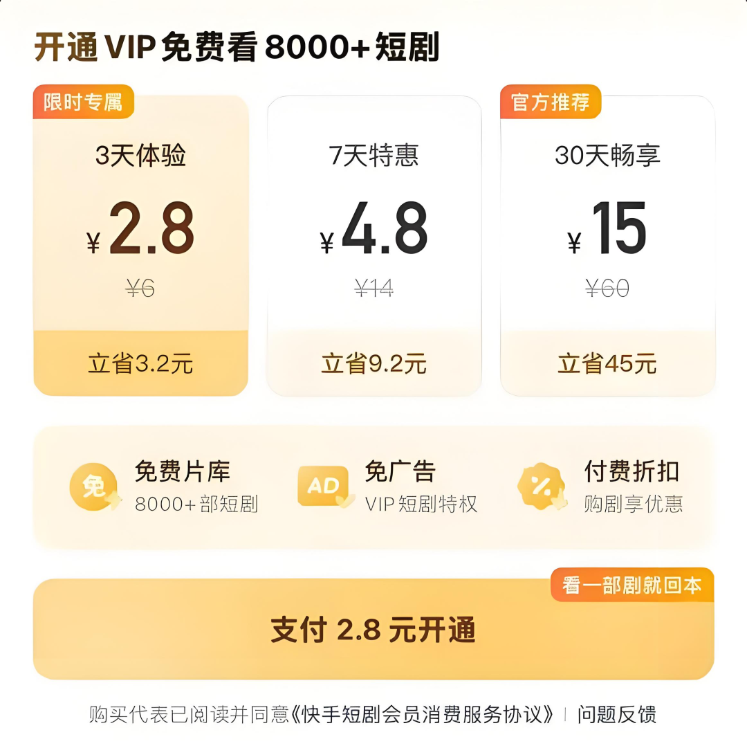 无独有偶,快手紧接着面向上游内容制作方推出了全新的商业变现模式“付费短剧会员”。用户开通会员后可在对应期限内免费观看数千部短剧,3天、7天、30天的会员卡优惠后价格分别为2.8元、4.8元、15元。