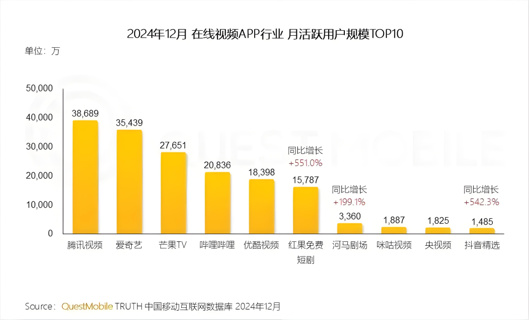 直到免费短剧APP红果的出现,为视频行业敲响了警钟。据官方透露的数据,红果在2024年6月时单月分账金额突破1亿元,很快就在9月超过2亿元,到了11月又跃升至3亿多元。另外,第三方机构QuestMobile的数据显示,红果APP在2024年12月的月活用户规模飙升至1.58亿,距离长视频平台优酷差距只有不到3000万。