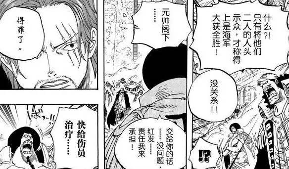 香克斯阻止了这场已经分出胜负的战斗,“给我个面子”“仍想继续战斗的人,红发海贼团来作你的对手”。他的出现终于让这场自大海贼时代开始以来最大的战役落幕了。