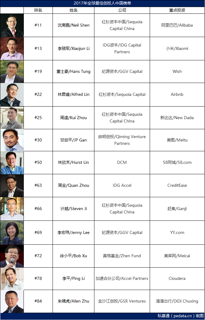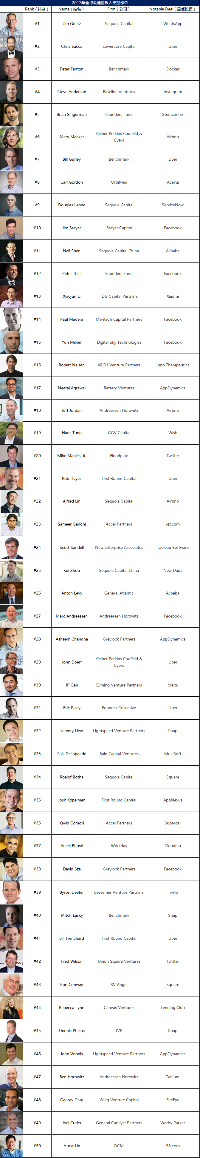 附2017年全球最佳创投华人榜单和完整榜单,如下: