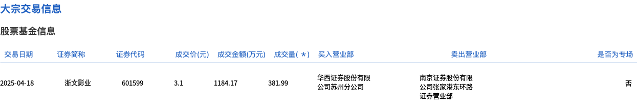 4月18日,浙文影业大宗交易成交381.99万股,成交额1184.17万元,占当日总成交额的17.5%,成交价3.1元,较市场收盘价3.44元折价9.88%。