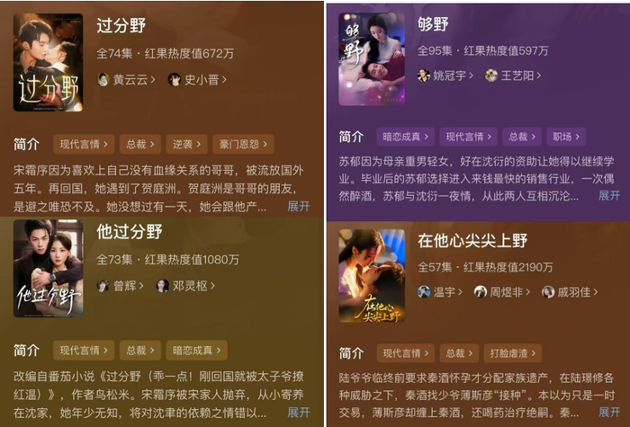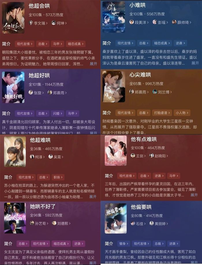 像《他超会哄》、《他超难哄》、《她超好哄》、《小难哄》、《心尖难哄》、《他的小难哄》、《偏偏要哄你》、《她哄不好了》等高达十几部跟哄相关的短剧。还有沦陷系列的《温柔沦陷》不够劲就《致命沦陷》,今天《在他指尖沦陷》明天《于他心尖沦陷》,建议下次直接在观众智商里沦陷得了。以及不知道到底在野什么的《过分野》到《他过分野》到《在他心尖野》,基本一年级小学生也可以用起短剧名当课后作业,只需学到主谓状结构这一课即可。