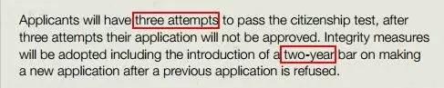 新政:入籍考试如果考了三次都没通过,就得等两年之后再参加考试。