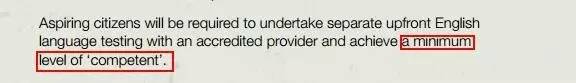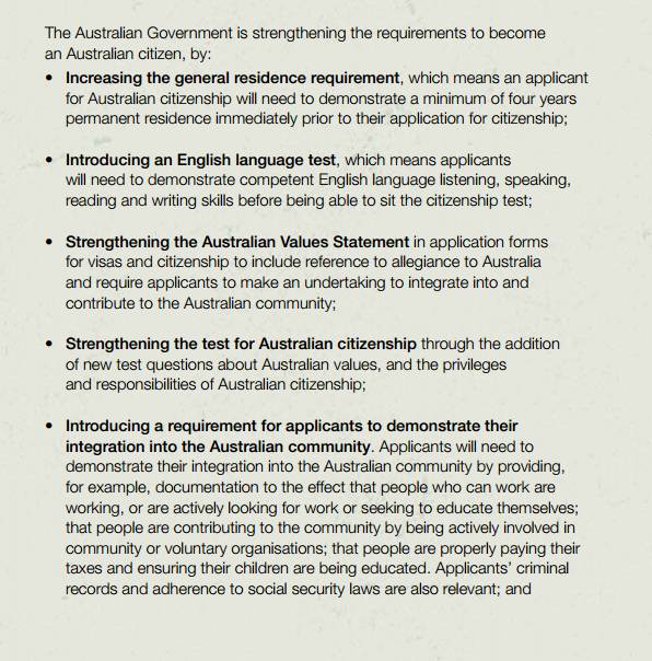 成为社区的一员,英语也是最基本的条件。 所以对于英语水平的要求是其中一项重要的改革。 另外一项重要改革将是澳洲公民入籍考试。 我们必须保证我们的入籍考试能过反应出申请人可以融入澳洲社会。 作为澳洲永久居民在澳洲生活4年,说流利的英文,分享澳洲的价值观,并且可以融入澳洲社会。