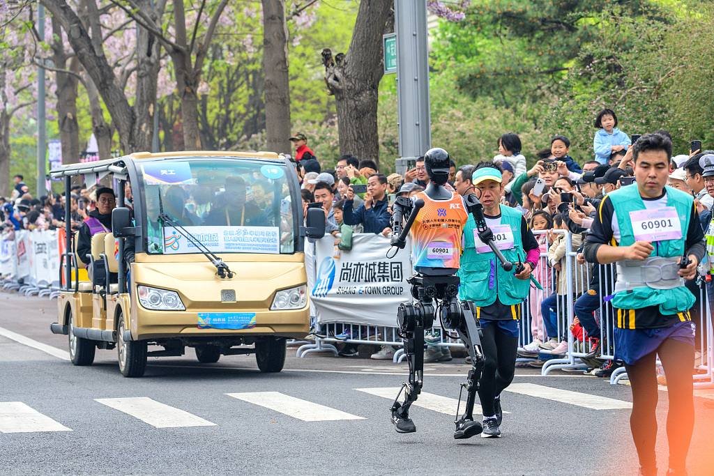 比赛采用“人机共跑”的形式。出于安全考虑,人类马松拉运动员被分在赛道右侧,参赛机器人在左侧的专用赛道内比赛,中间以护栏隔开。按照比赛规则,包括人类领跑员在内,每支赛队最多可安排3名参赛选手同时进入赛道,现场大多数队伍都是采用了“一名人类领跑员+一名控制员+机器人”的配置。