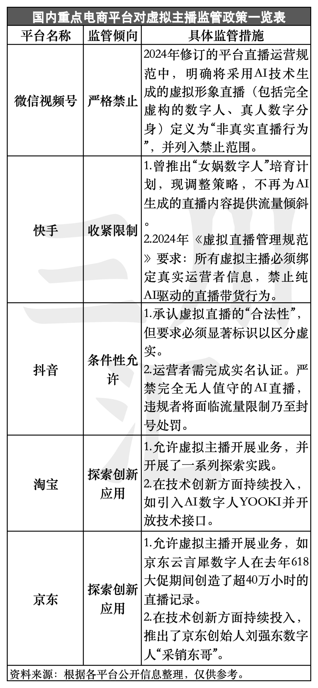 三川汇文化科技研究院调研发现,目前,抖音、快手等头部平台已对虚拟主播实施严格的管控措施。其中,微信视频号率先将虚拟直播纳入违规范畴。其2024年修订的平台直播运营规范明确指出,采用AI技术生成的虚拟形象进行直播属于“非真实直播行为”,无论是完全虚构的数字人还是真人数字分身,均被列入禁止范围。