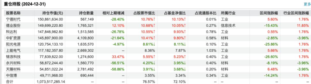 2024年末,国投瑞银先进制造前十大重仓股仍为清一色的新能源产业链企业,包括宁德时代(300750.SZ)、中矿资源(002738.SZ)、科达利(002850.SZ)等赛道龙头。