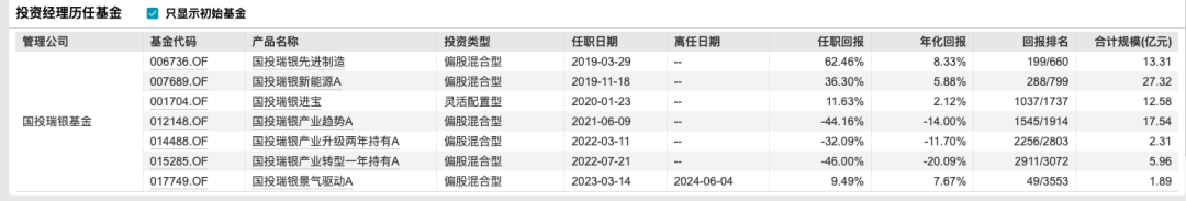 2024年二季度,施成又卸任了国投瑞银景气驱动管理职务,其自2023年3月开始管理该产品,任职回报9.49%,年化回报7.67%,回报排49/3553,是在管产品中表现最好的一只。