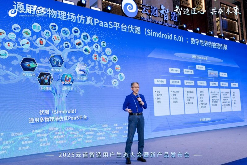 屈凯峰表示,CAE(物理引擎)与AI(数据引擎)共同构成了数字世界的两大核心引擎。云道智造的使命是打造“数字世界的物理引擎”,即PI(Physical Intelligence)。这一概念在云道智造通用多物理场仿真平台伏图(Simdroid)上得到了具象化体现。