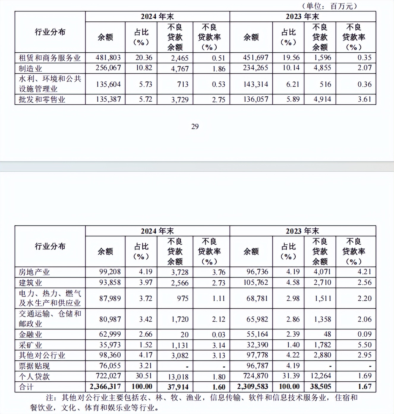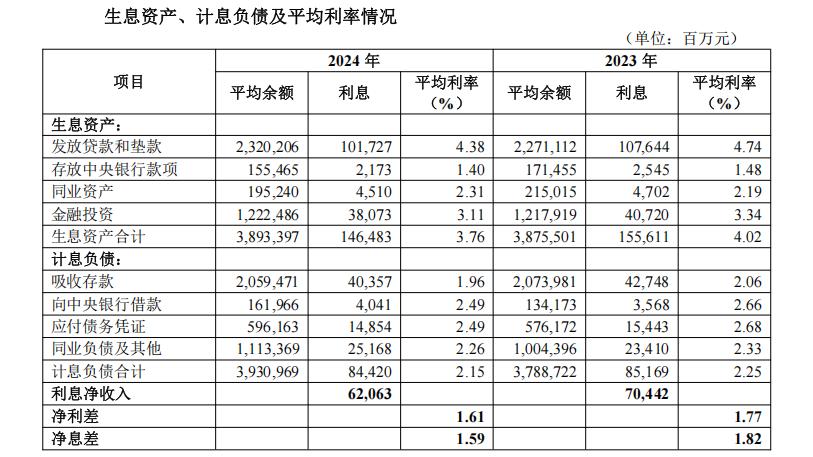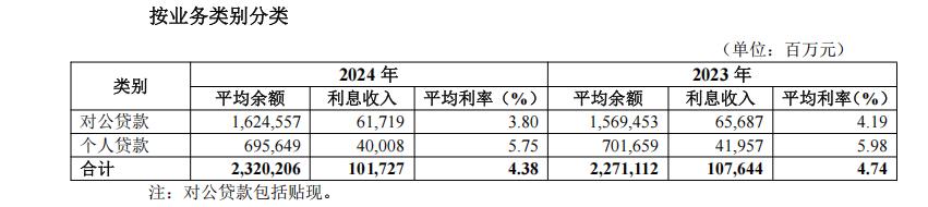 从发放贷款和垫款平均收益率情况看,2024年,对公贷款平均余额1.62万亿元,利息收入617.19亿元,平均利率3.8%,较2023年的4.19%有所下降;个人贷款平均余额6956.49亿元,利息收入400亿元,平均利率5.75%,低于2023年的5.98%。