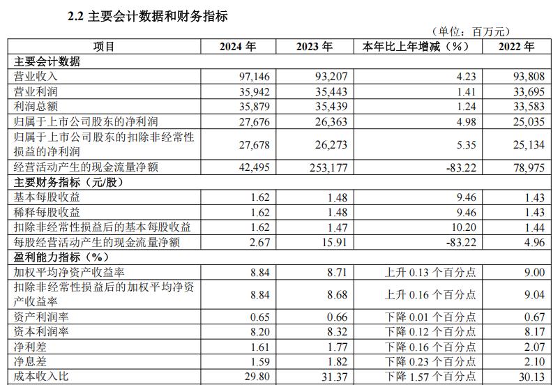 从现金流情况看,该行2024年经营活动产生的现金净流入42.5亿元,同比减少83.22%。