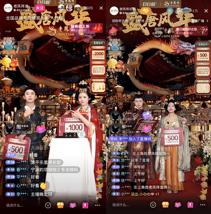 “鼓声响,盛唐现”,4月15日上午10时,中华老字号品牌老凤祥在抖音设立的“老凤祥总部福利官方号”开播,推出了为期3天的“盛唐风华”系列新品大场首秀。本轮新品首发直播,集传统文化展演、匠心工艺解密及重磅团购优惠于一体,丰富精致的国潮内容吸引了超197万网友观看。直播间还上架了最高优惠2000元的新品尝鲜券和多款足金团购商品,将实打实的优惠福利给到消费者,进一步助力老字号品牌实现线上线下销售联动、激发实体门店国潮消费。