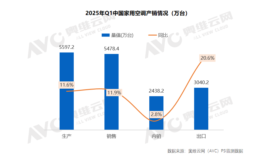 奥维云网(AVC)产销PSI数据显示,2025年一季度空调生产5597.2万台,同比增长11.6%;销售5478.4万台,同比增长11.9%。其中内销2438.2万台,同比增长2.8%;出口3040.2万台,同比增长20.6%。产销均实现双位数增长,出口表现优于内销。